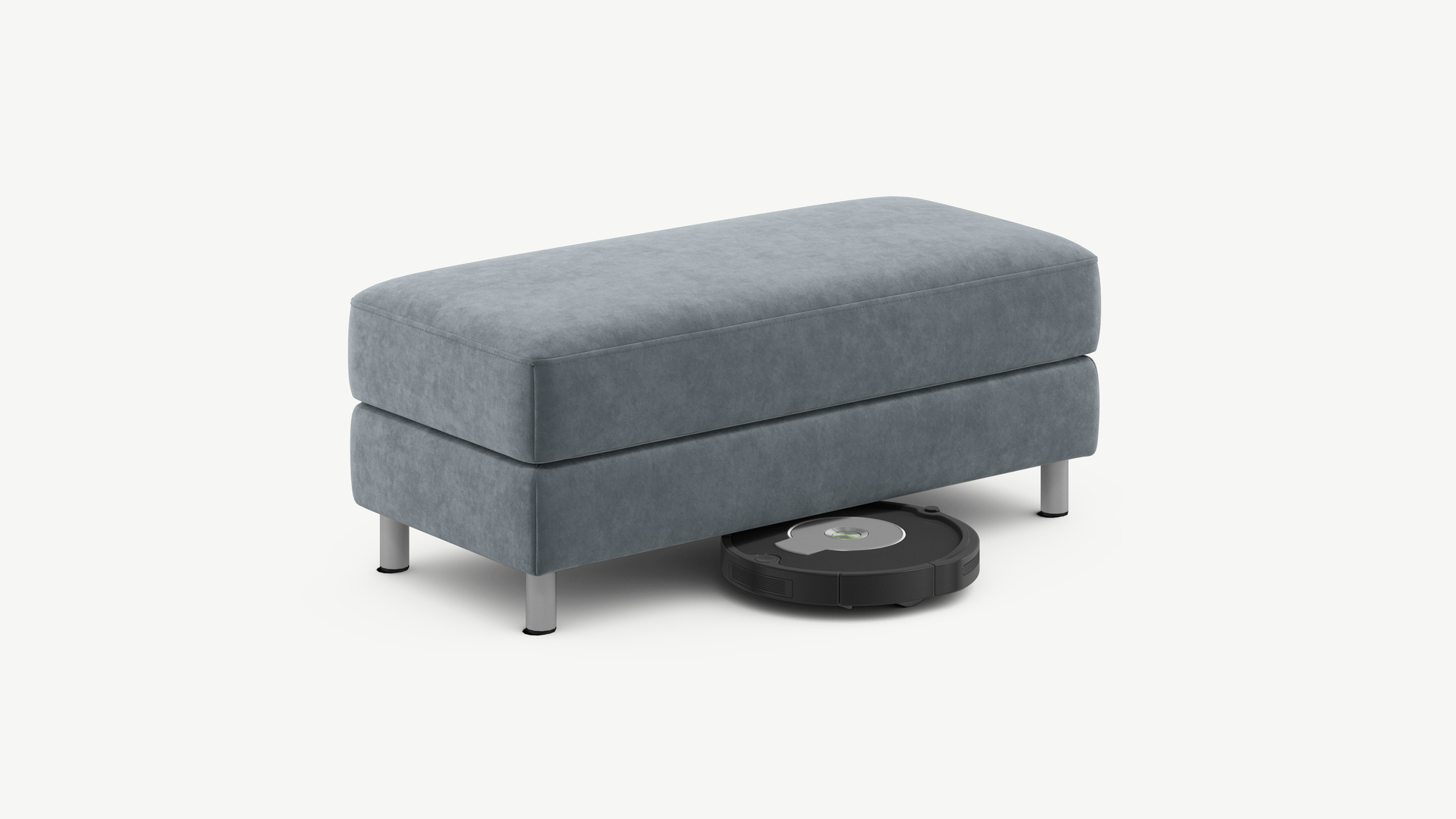 Под банкеткой с высокими цилиндрическими опорами проходит робот-пылесос.