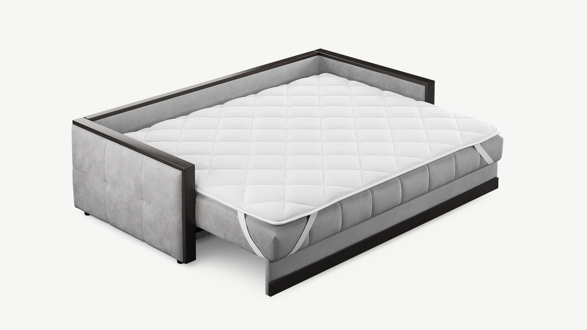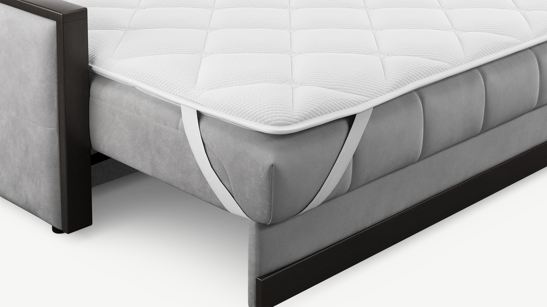 Топпер можно использовать как на диване, так и на матрасе. Фиксация на поверхности спального места осуществляется с помощью широких резинок в четырех угловых точках.