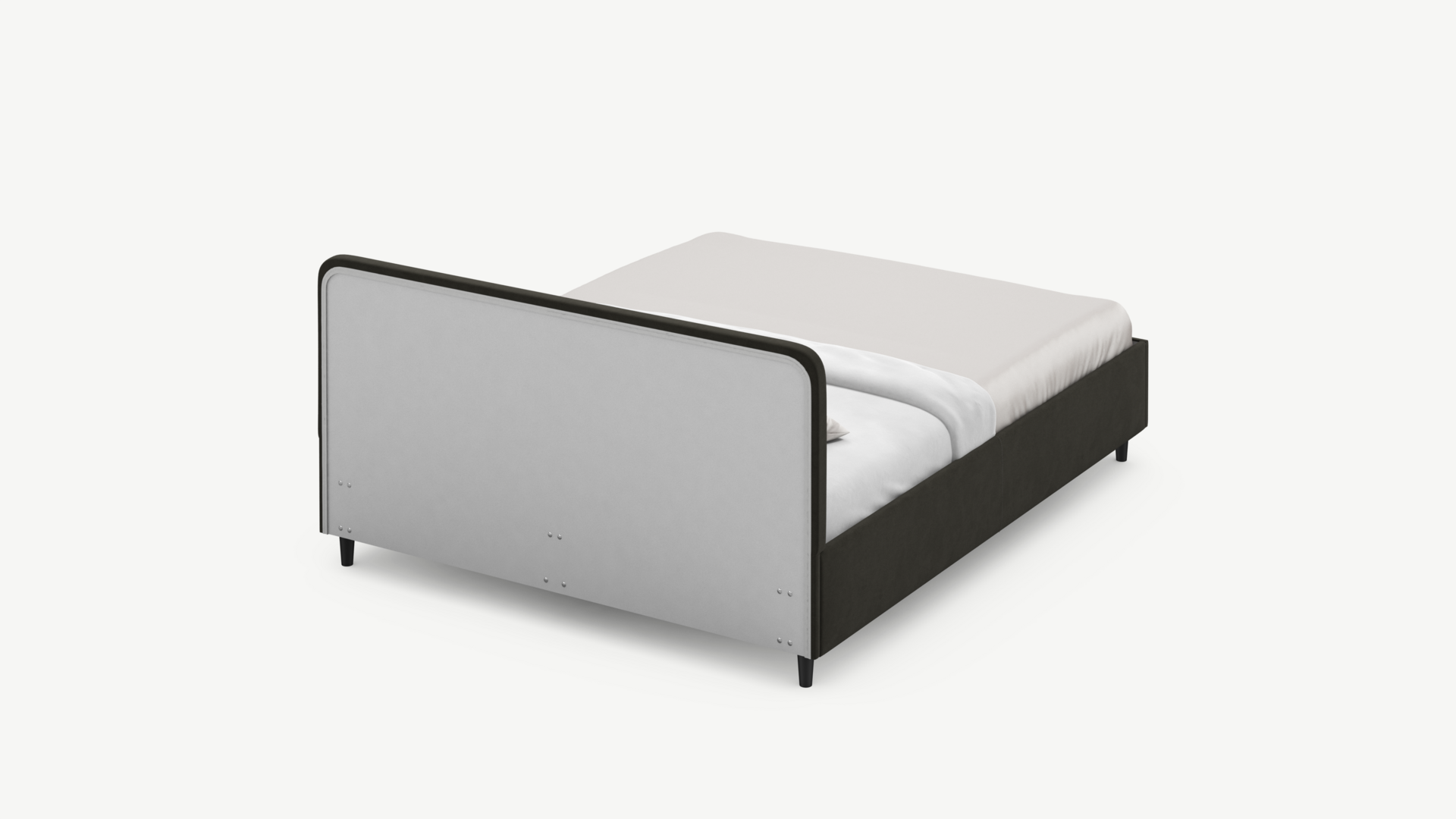 Царга, задающая пропорции, благодаря гладкости своей фактуры подчеркивает центральный элемент декора. Высокие опоры приподнимают фигуру кровати над полом и добавляют её образу визуальной легкости.