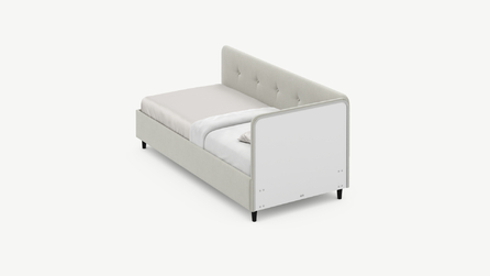 Угловая односпальная кровать MOON FAMILY 1253 с мягкой спинкой и изголовьем обладает округлыми формами, привносящими в интерьер нотки нежности. Изголовье, украшенное пуговицами, добавляет окружающему пространству шарм и уют. Высокие опоры придают кровати визуальной легкости, а также обеспечивают удобство во время уборки.