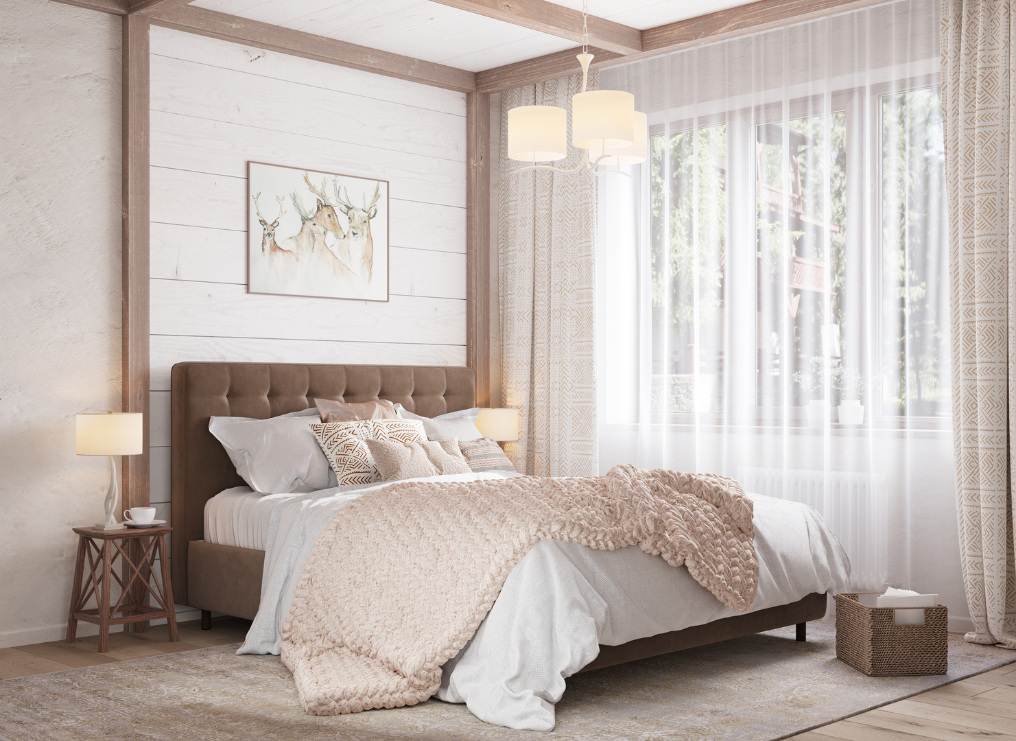 Творчески завершить образ спальни помогут дополнительные аксессуары: например, декоративные подушки-валики MOON 1165, прикроватные тумбы, банкетки, а также покрывала-саше.